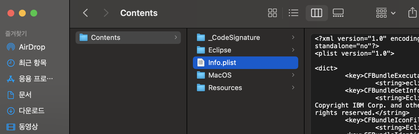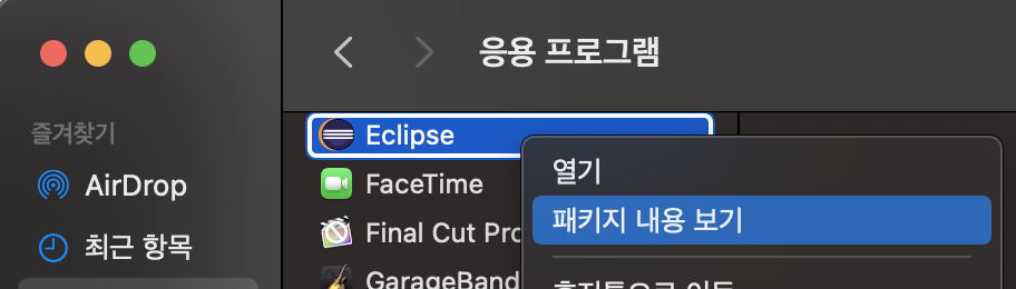 1) 응용프로그램 > Eclipse 오른쪽 클리하여 '패키지 내용 보기' 선택