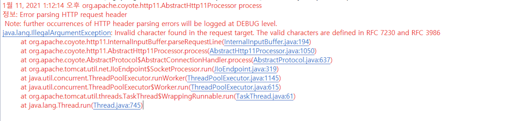 java.lang.IllegalArgumentException : Invalid character found in the request target.